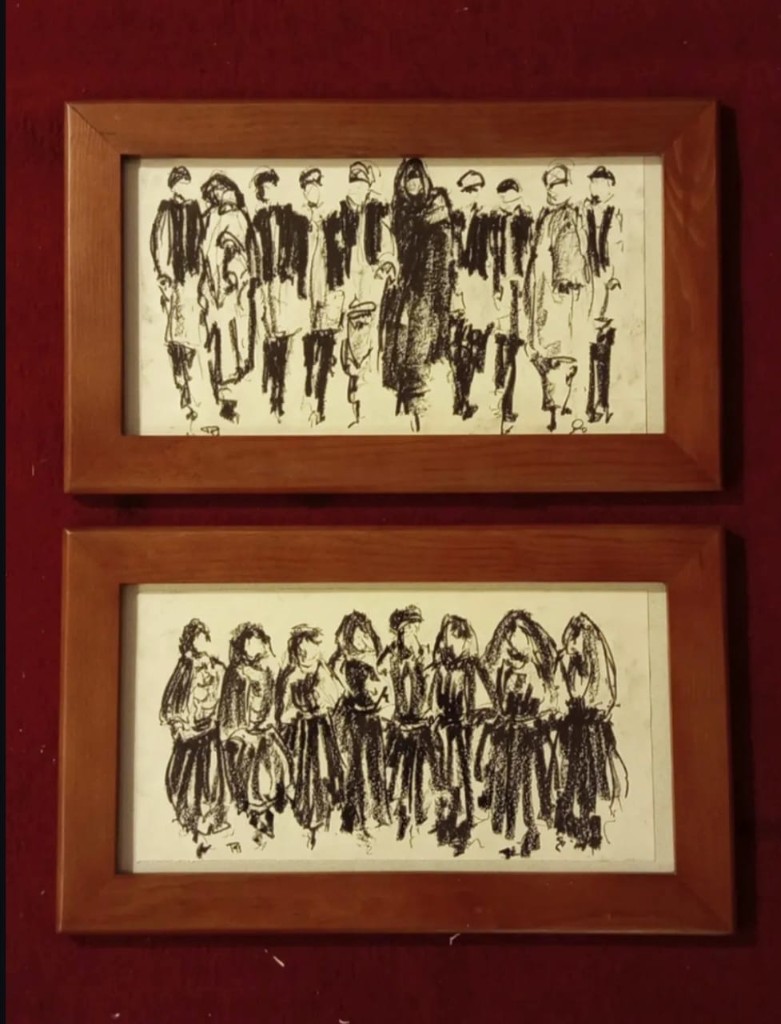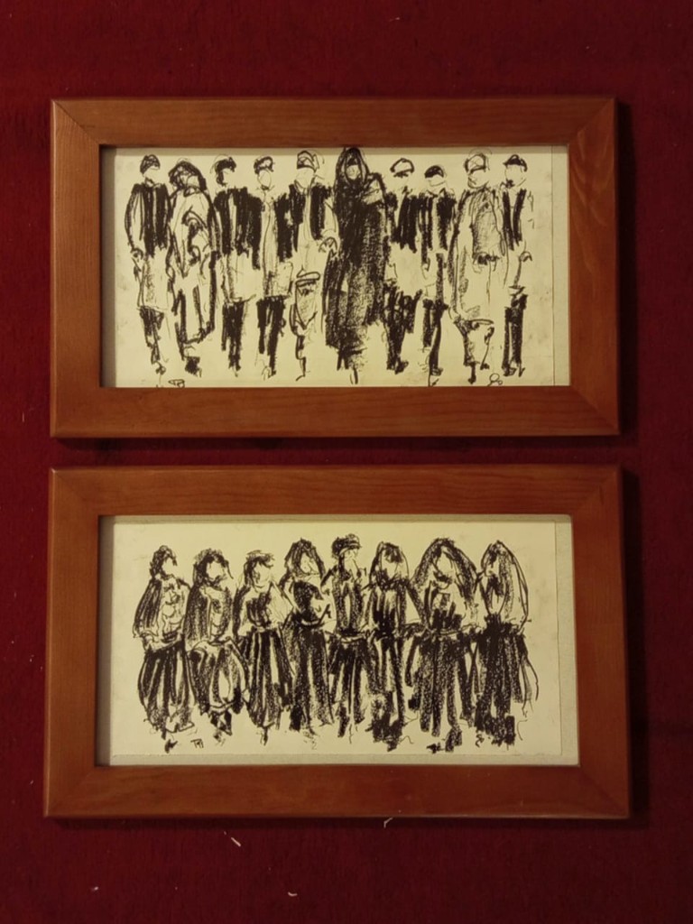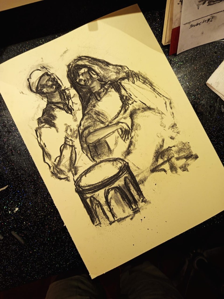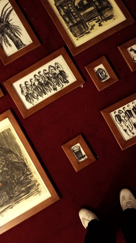 A historic monument standing in permanence, facing contemporary artistic expression documenting the present moment — particularly as most of the works were executed in charcoal, a medium direct and closely tied to reality.