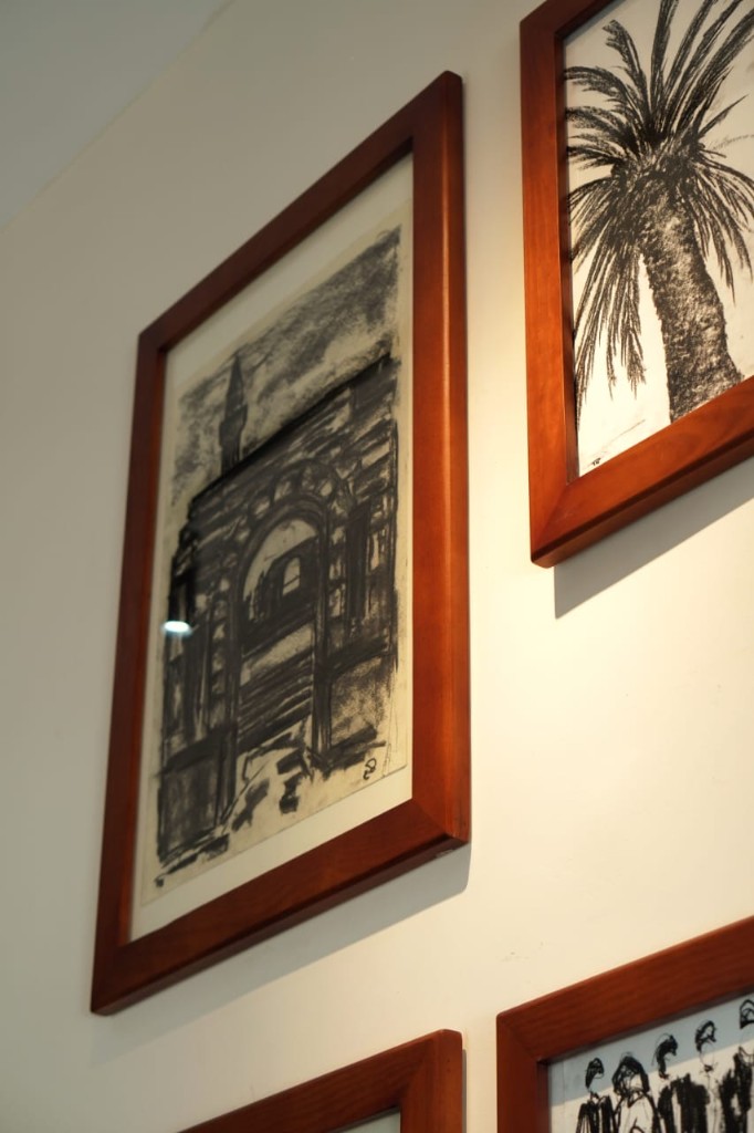A historic monument standing in permanence, facing contemporary artistic expression documenting the present moment — particularly as most of the works were executed in charcoal, a medium direct and closely tied to reality.